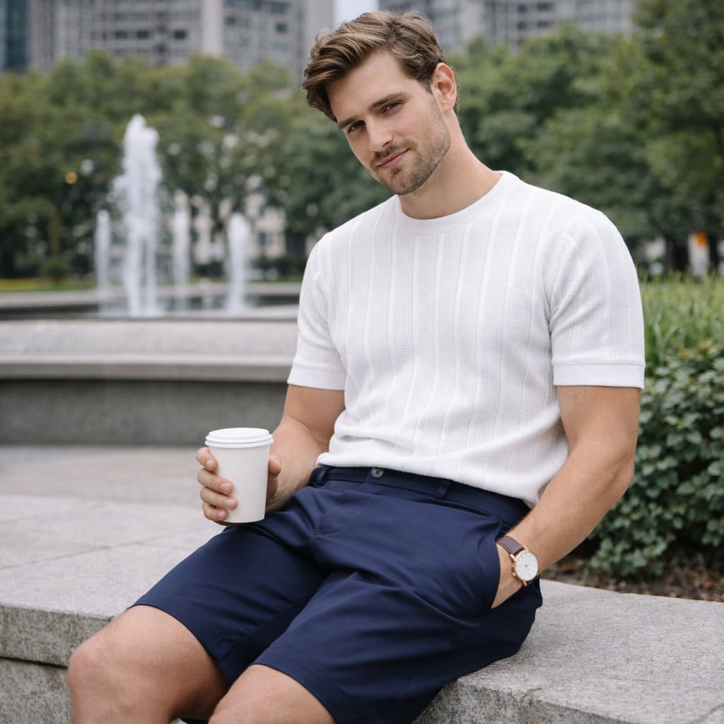 This luxury knit T-shirt features a vertical ribbed texture that enhances the silhouette while delivering a clean, sophisticated look. The refined knit construction offers breathability, softness, and structure, making it ideal for elevated casual styling. Perfect for city days or relaxed social settings, this piece brings effortless elegance to the modern wardrobe.